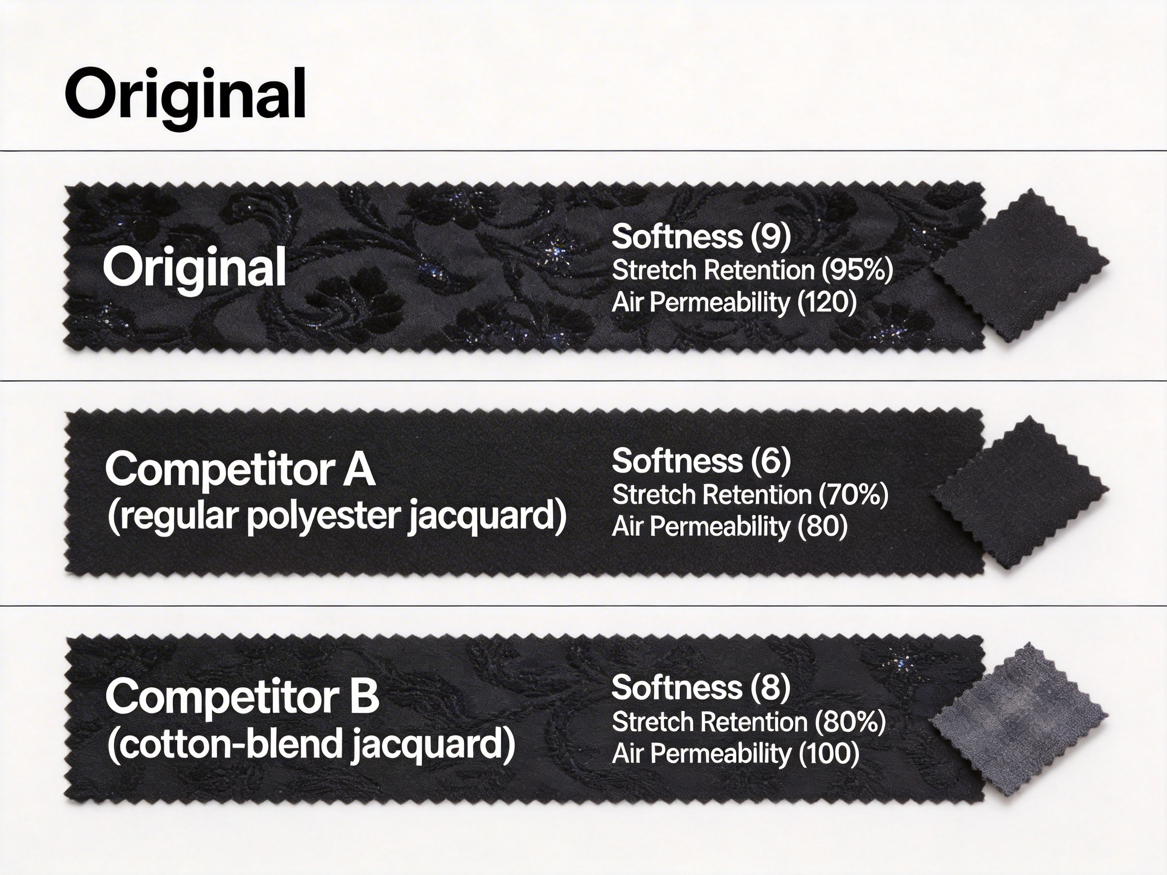 Feature Black Slight Intermingled DTY Jacquard Fabric Regular Polyester Jacquard (Competitor A) Cotton-Blend Jacquard (Competitor B)
