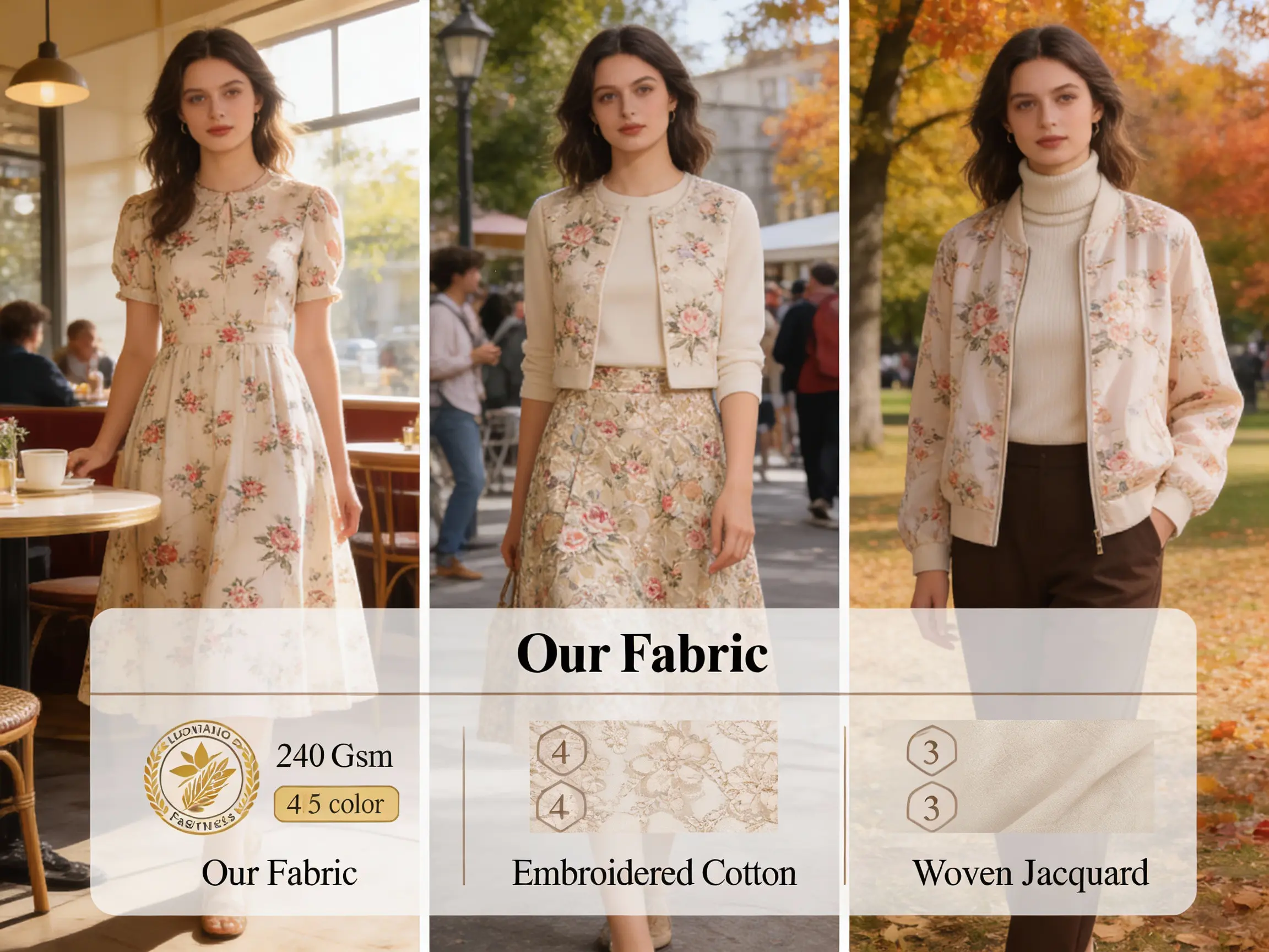 | Floral-Patterned Knitted Jacquard (Our Product) | 60% Viscose, 35% Nylon, 5% Spandex | 240 | Excellent (Fluid & Elegant) | Yes (5% Spandex) | 4-5 (Excellent) | 8.50-9.50 | 500 Meters |