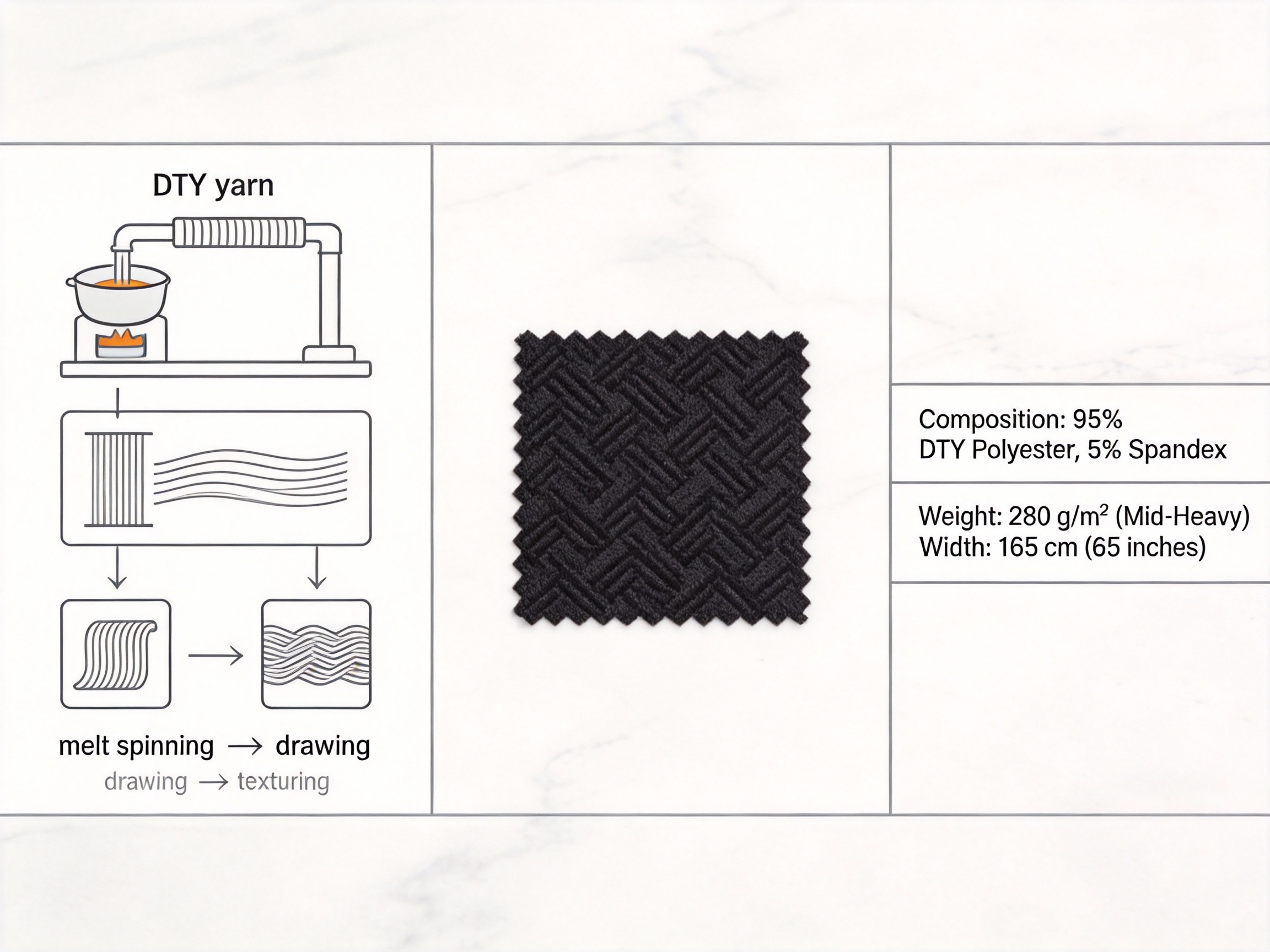 | Composition | 95% DTY Polyester, 5% Spandex | Blends DTY softness with spandex stretch for comfort and flexibility |