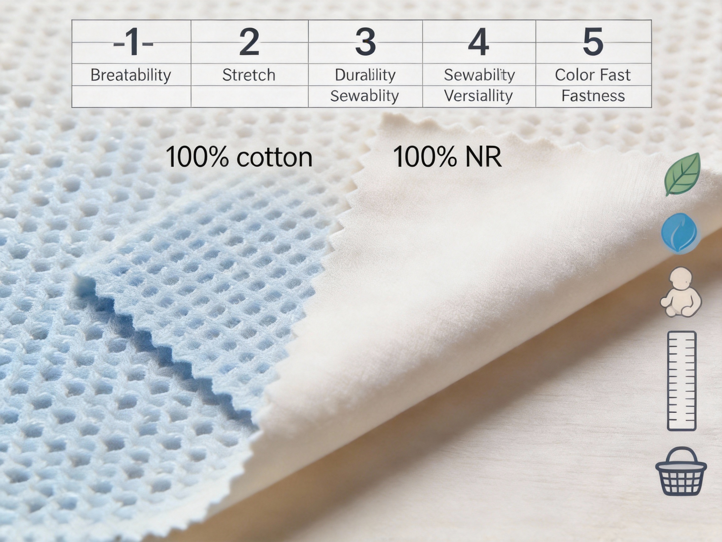 - Stretch & Recovery: NR and spandex provide 20–30% stretch (depending on the blend), with excellent recovery—meaning the fabric bounces back to its original shape after stretching.