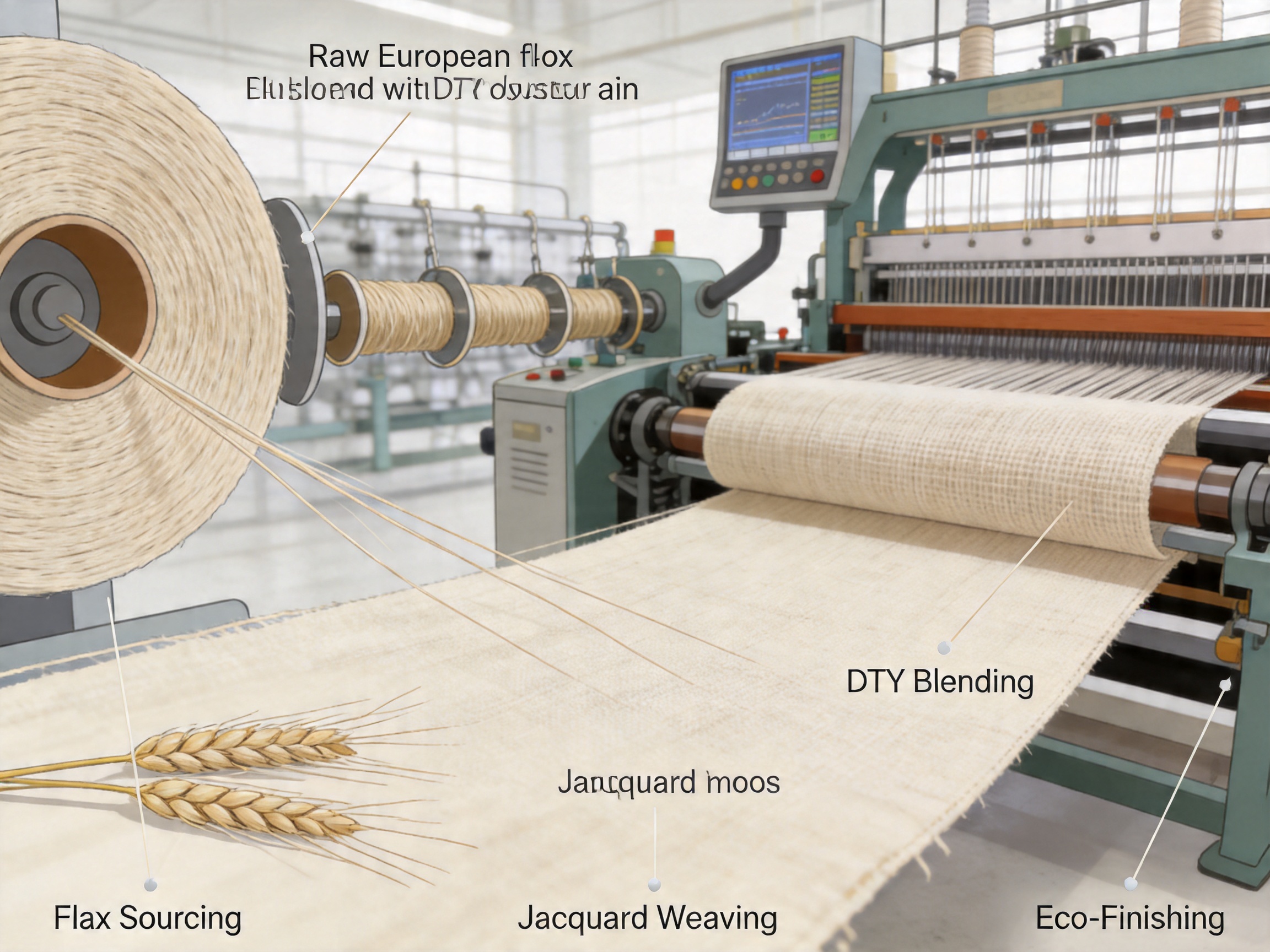 Once the raw materials are sourced, the linen and DTY polyester yarns are blended in optimal ratios (typically 85% linen to 15% DTY polyester). This ratio is carefully chosen to maximize the benefits of both fibers: the linen contributes to breathability and aesthetic appeal, while the DTY polyester adds durability and resistance to wrinkling. The blending process uses advanced spinning machines that intermix the yarns evenly, ensuring that the final fabric has a consistent texture and performance across its entire surface.