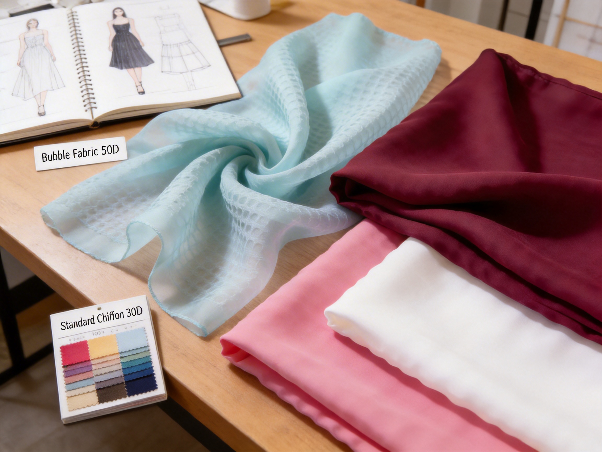 - Heavier Bubble Chiffon: For designers looking for more structure, this variant offers a slightly higher weight (typically 70D-80D) without losing the softness of the lighter version. It’s ideal for A-line skirts, structured dresses, and even lightweight jackets.