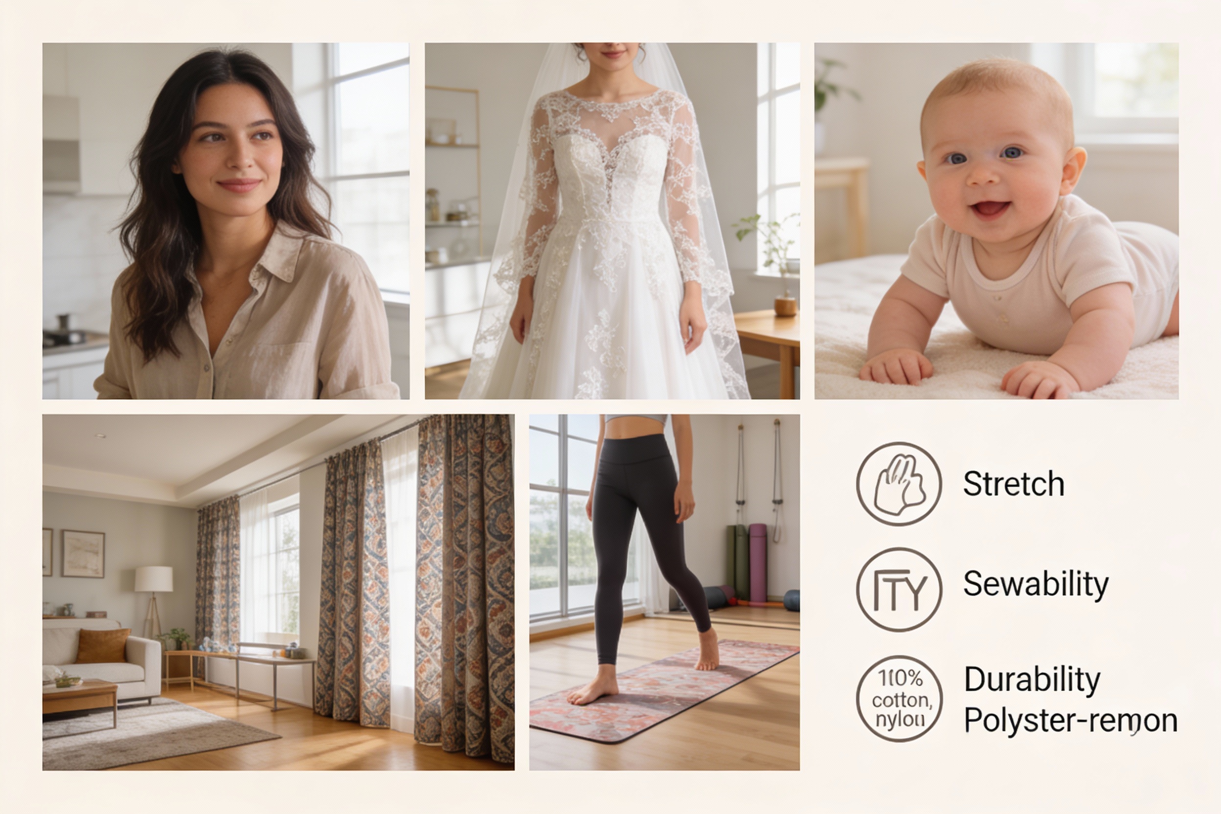Common Uses Dresses, blouses, baby clothes, overlays T-shirts, jeans, bed sheets Activewear, stockings, raincoats Suits, dresses, curtains