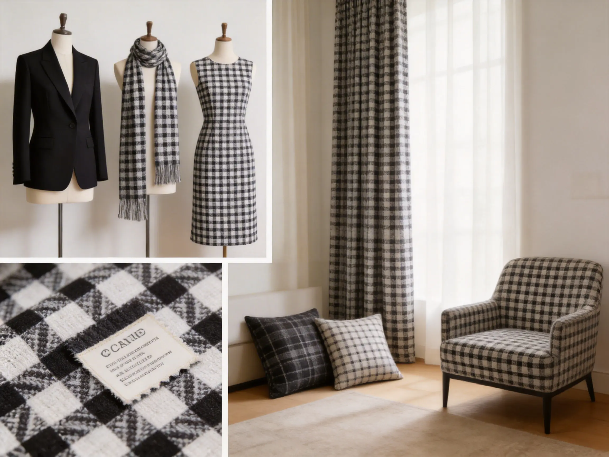 The image below showcases various applications of Jacquard Black And White Grid Fabric in fashion and home decor: