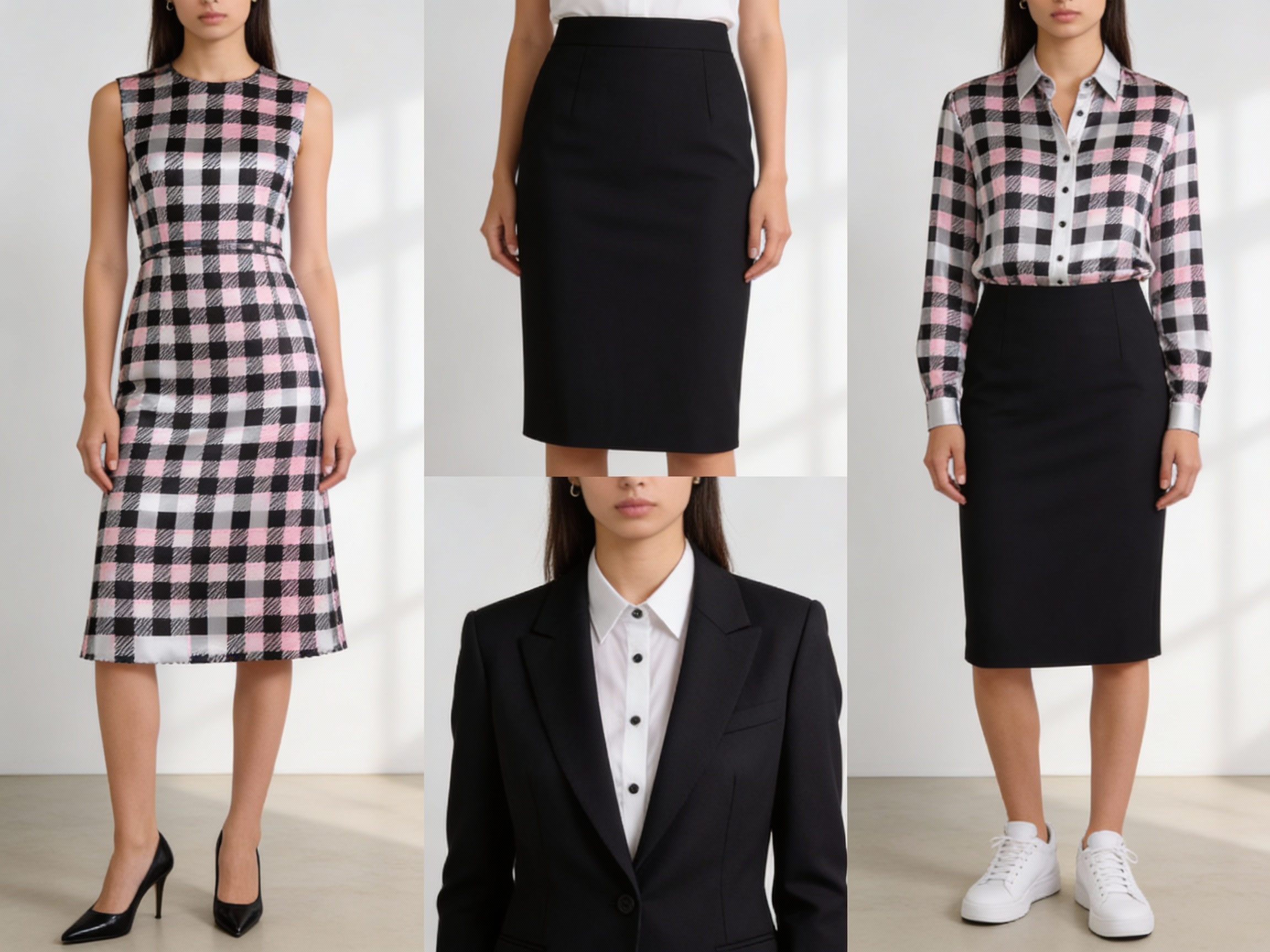 The fabric’s design is a standout feature, featuring a bold check pattern in black and white with a cleverly integrated pale pink shadow on the black lines. The light grey background has a subtle lustre, adding a touch of elegance without being overly shiny. This design is optimized for structured garments: the check size is neither too large (which can overwhelm the wearer) nor too small (which can appear busy), making it suitable for a wide range of silhouettes.