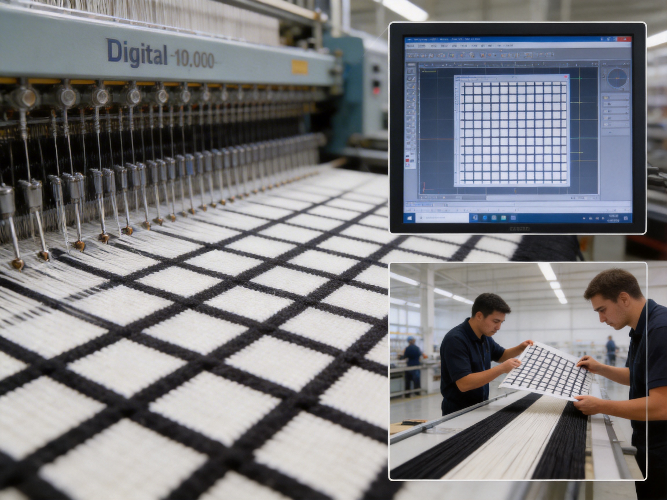 The fabric is woven on digital jacquard looms—each equipped with 10,000+ hooks that are controlled by a computer. This digital control allows for precise pattern creation, as the computer translates a CAD (Computer-Aided Design) file of the grid pattern into instructions for the loom. Each hook in the loom corresponds to a single yarn, allowing the weaver to create complex patterns with ease.